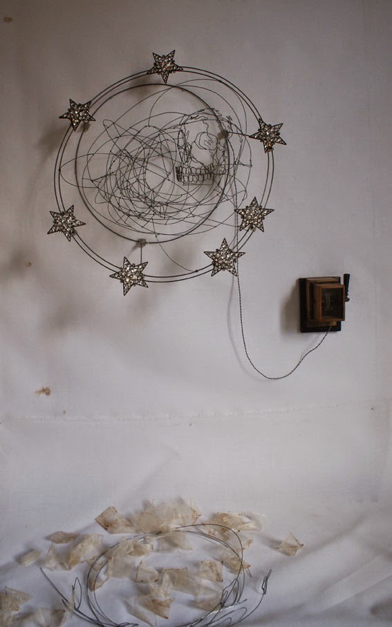 Fils de fer,étoiles strass (couronne de vierge XIXeme)et leds , interrupteur ancien, batterie au lithium et son chargeur